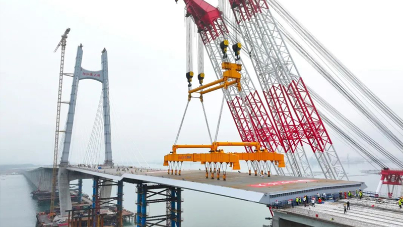 3月30日上午10時(shí)02分 隨著最后一塊鋼箱梁成功吊裝到位 陽江港大橋順利合龍 如一條巨龍橫臥海面 標(biāo)志著廣東省濱海公路 海陵大堤段至溪頭段實(shí)現(xiàn)全線貫通 向通車目標(biāo)邁出了重要一步! 陽江港大橋全長4777.2米 是廣東濱海旅游公路陽江海陵大堤 至溪頭段公路項(xiàng)目的控制性工程 由保利長大工程有限公司承建 巨力索具負(fù)責(zé)該項(xiàng)目鋼箱梁吊具制作 鋼箱梁采用大節(jié)段吊裝方案,分6個(gè)節(jié)段 最大梁段長90米,最小梁段長74.5米