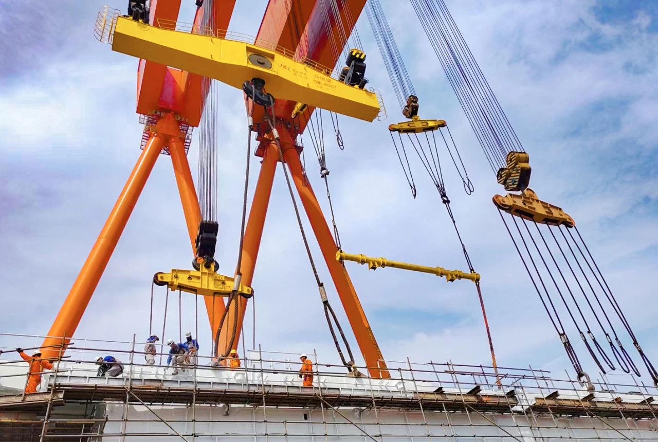 2023年12月,由我國(guó)自主設(shè)計(jì)建造的亞洲首艘圓筒型“海上油氣加工廠”“海洋石油122”浮式生產(chǎn)儲(chǔ)卸油裝置——“??惶?hào)”超級(jí)能源碗在青島完成主體建造,巨力索具提供800噸吊梁、400噸、500噸吊排及配套索具組成成套吊裝系統(tǒng),全程配合吊裝順利進(jìn)行。