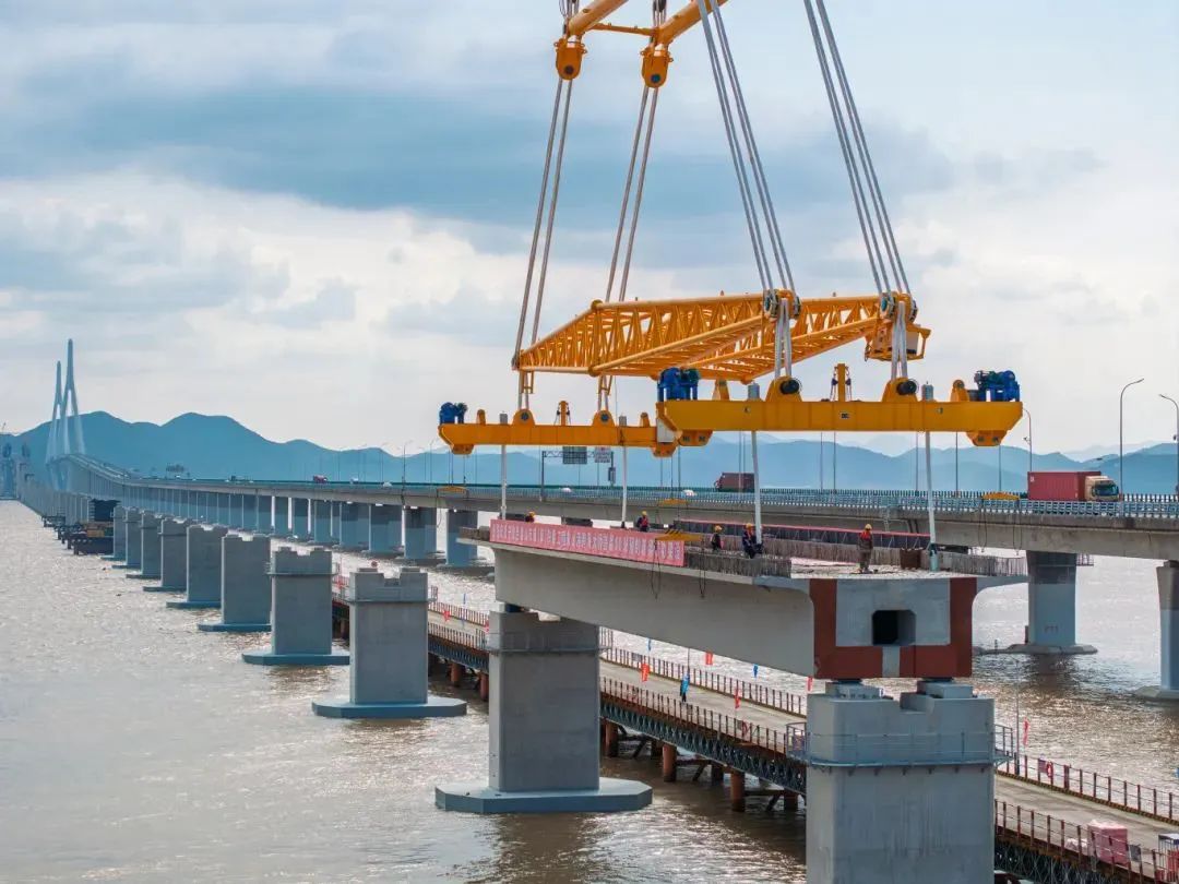 11月5日,隨著現(xiàn)場(chǎng)指揮一聲令下,國(guó)內(nèi)首座市域(郊)鐵路跨海大橋,重1700噸的預(yù)制箱梁穩(wěn)穩(wěn)落至橋墩上,巨力索具箱梁吊具全程保障首榀箱梁成功架設(shè),標(biāo)志著大橋全面進(jìn)入上部結(jié)構(gòu)施工階段。