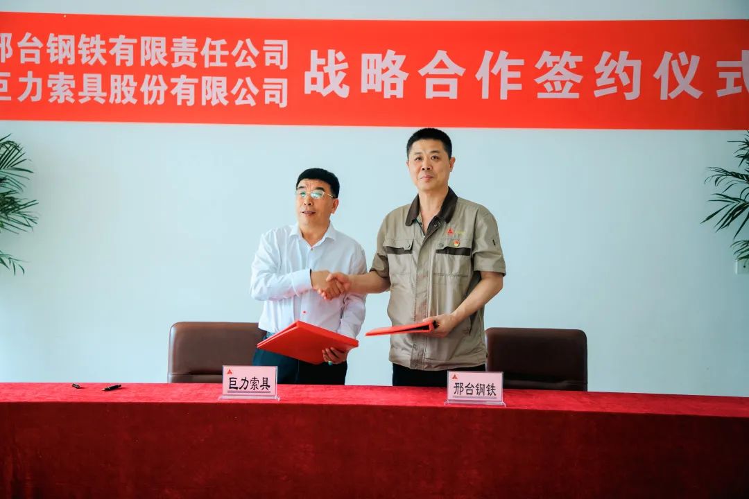 2023年6月19日,巨力索具與邢臺(tái)鋼鐵簽訂戰(zhàn)略合作協(xié)議,邢臺(tái)鋼鐵董事長張育明,巨力索具董事長楊建國、總裁楊超出席簽約儀式,并就合作情況展開詳細(xì)座談。
