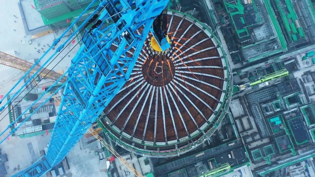 吊裝過程中,穹頂宛如一個巨型“帽子”,它是保證反應堆廠房安全殼完整性和密封性的重要組成部分。據(jù)了解,本次穹頂?shù)跹b呈現(xiàn)整體吊、物項多、總重大、精度高等特點,包含鋼襯里結構以及支撐籠架、部分鋼筋和預應力導管、全部貫穿件、加強板、內(nèi)部鋼結構、設備支吊架、噴淋系統(tǒng)、照明系統(tǒng)、消氫裝置、換熱器設備、探測設備等設備,總重量為739.016噸。