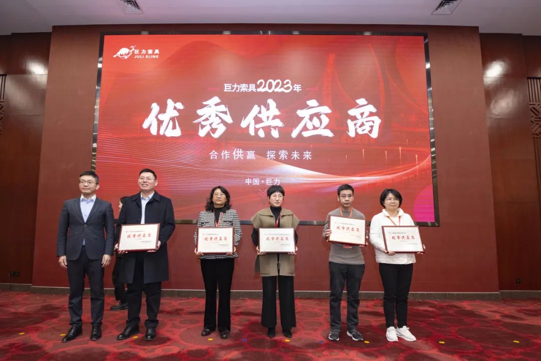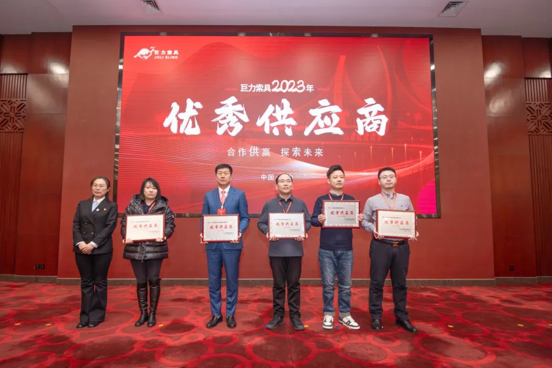 2023年,巨力索具和供應(yīng)商伙伴在高層互訪、產(chǎn)品開發(fā)、技術(shù)共享等領(lǐng)域取得了諸多成果。為感謝供應(yīng)商在品質(zhì)、創(chuàng)新、保供及合作等方面作出的突出貢獻(xiàn),本次大會(huì)向10家供應(yīng)商授予了“優(yōu)秀供應(yīng)商”獎(jiǎng)項(xiàng)。